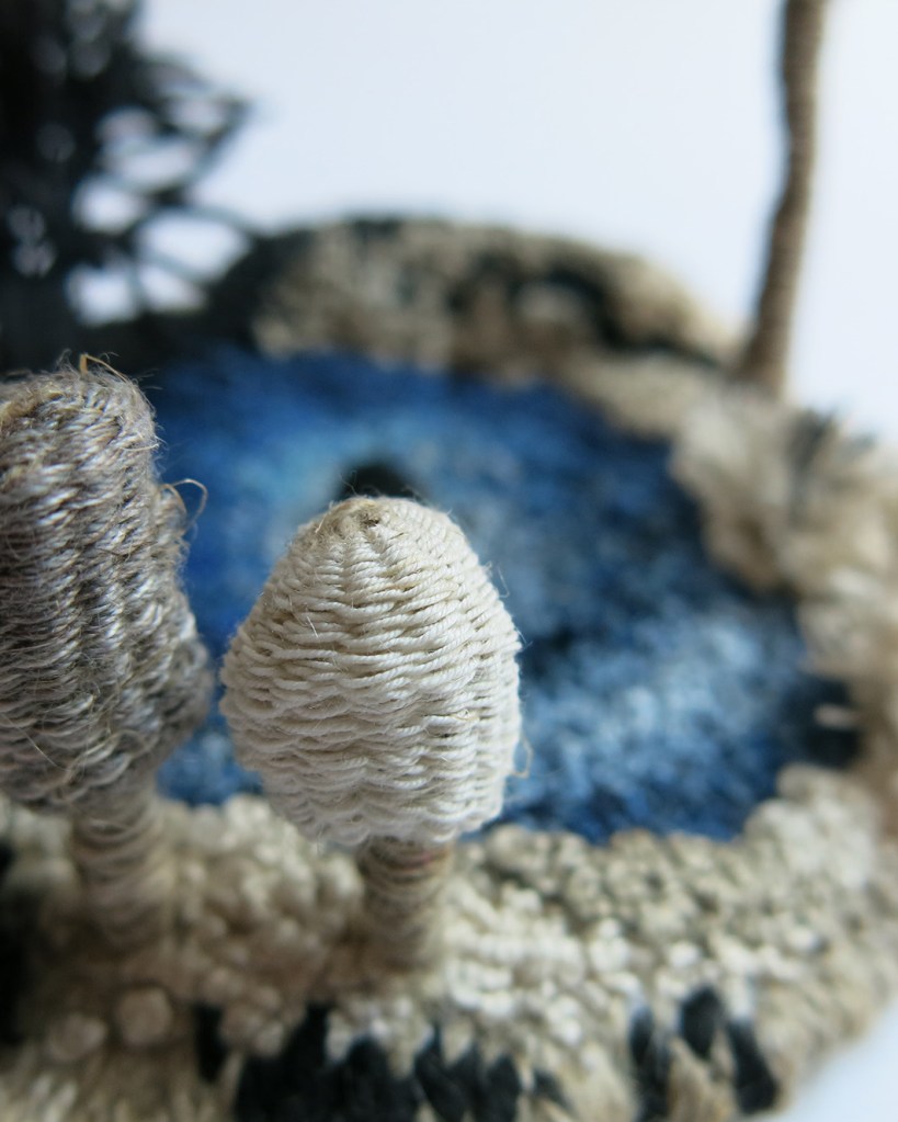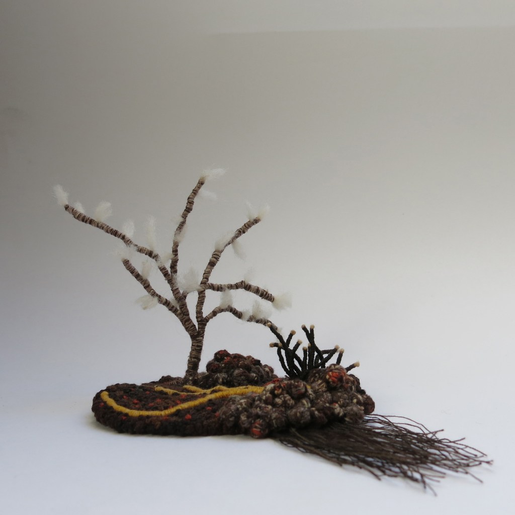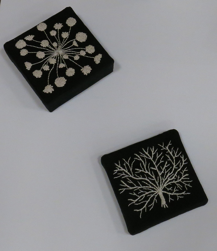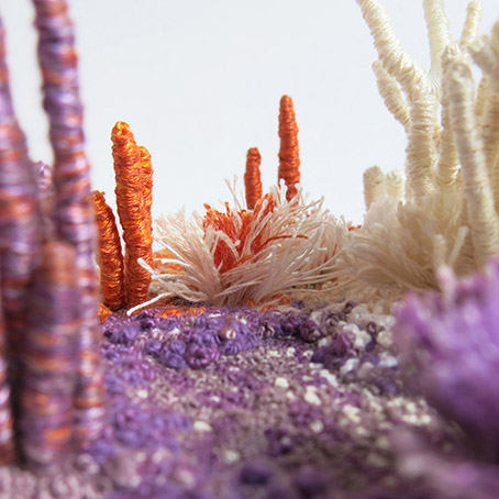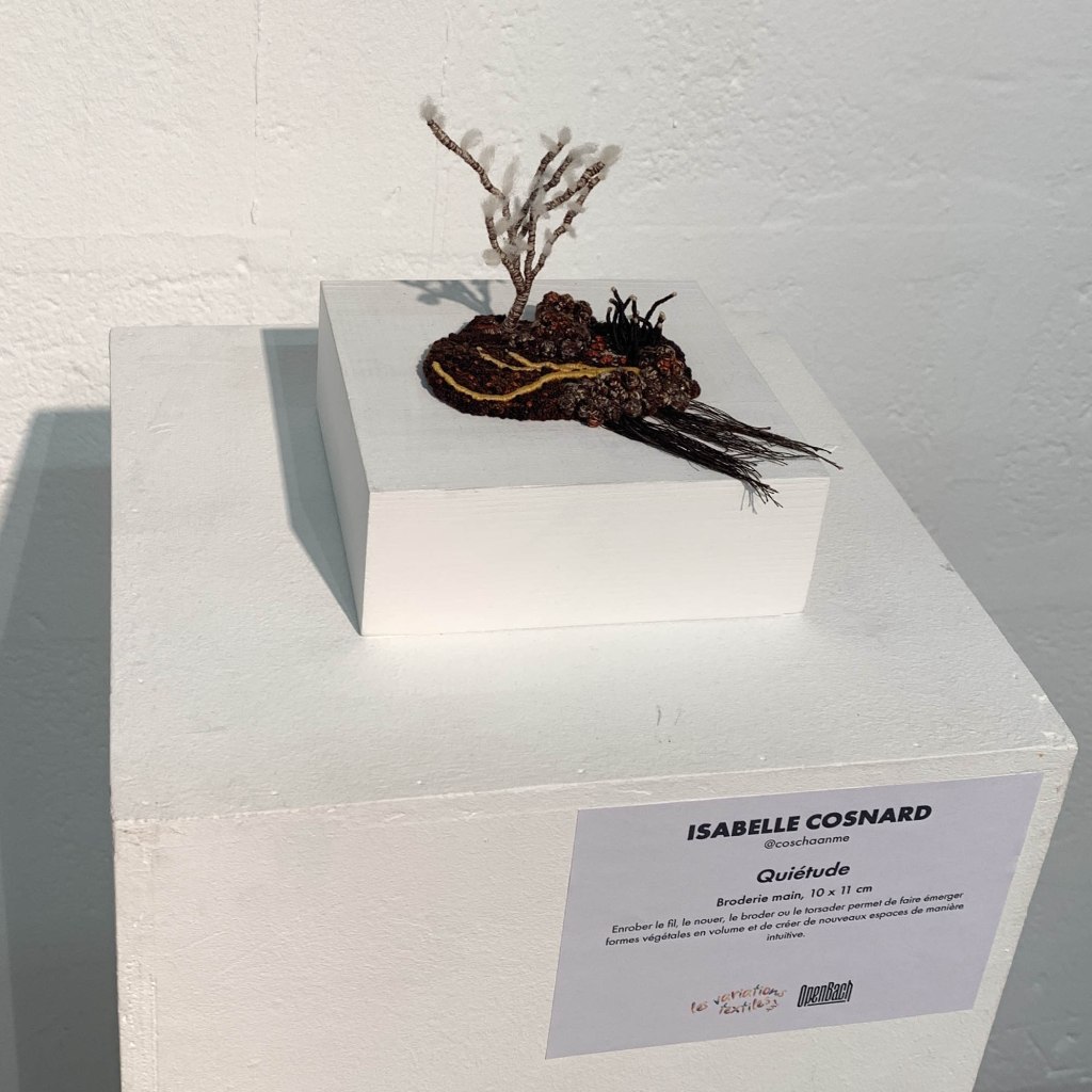 « J’assemble et brode des fils pour leur donner du volume, de la profondeur afin de créer des paysages imaginaires ou plus intimes. Mon rapport à la nature, comme sujet artistique et façon de vivre, s’invite de plus en plus fréquemment dans ma pratique. »