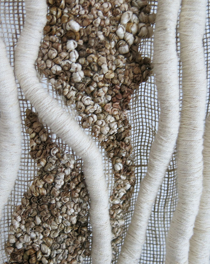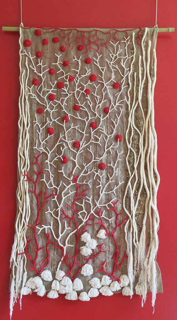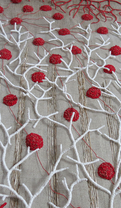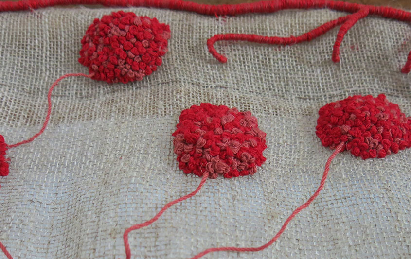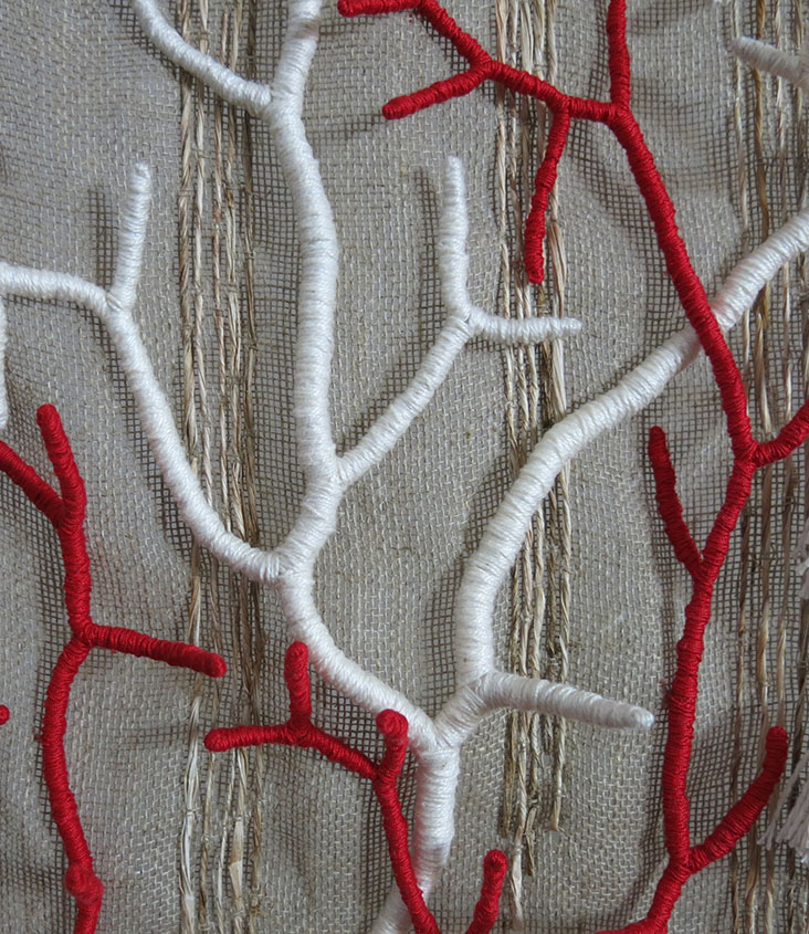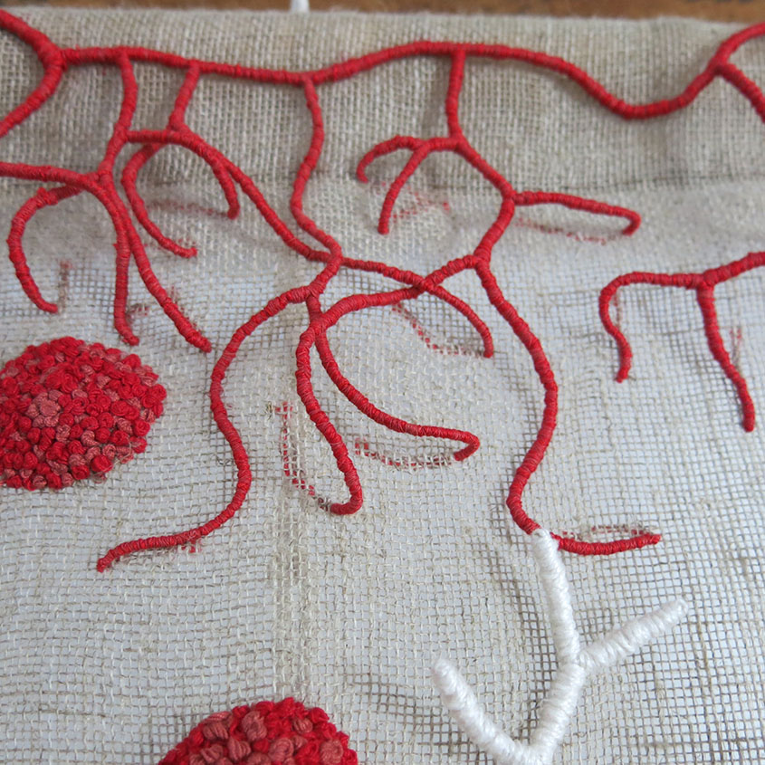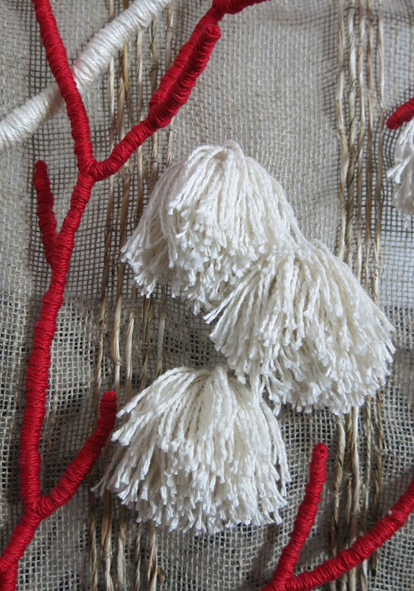 Broderie sur toile de jute, lin, hémérocalles, coton (155 x 85 cm)