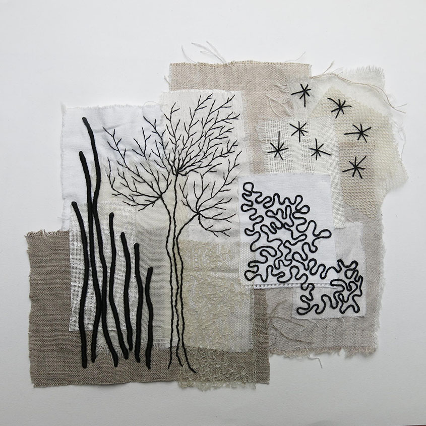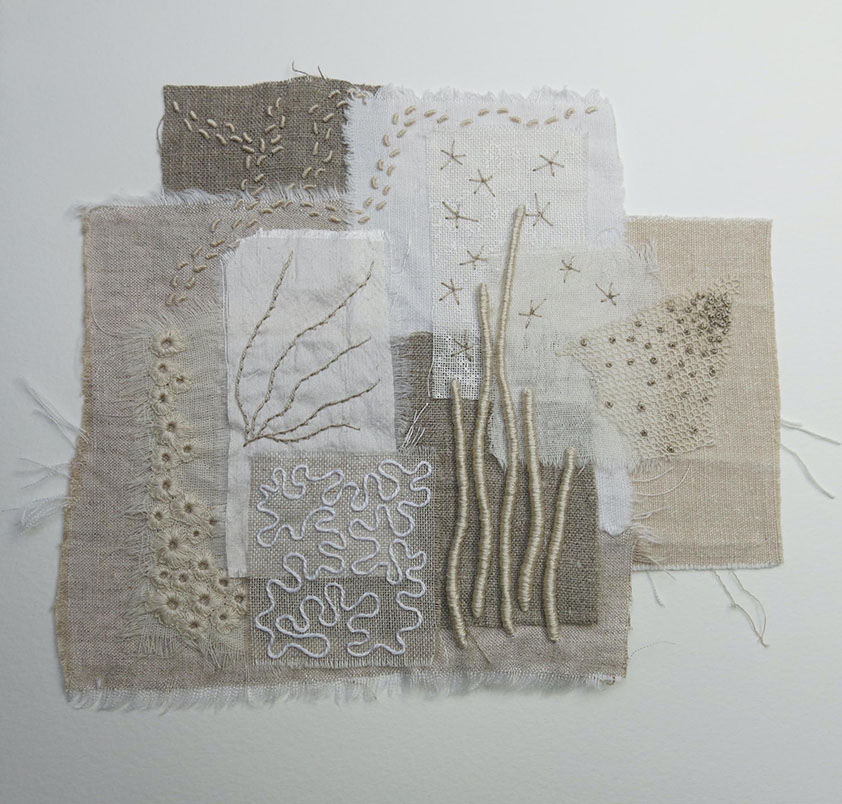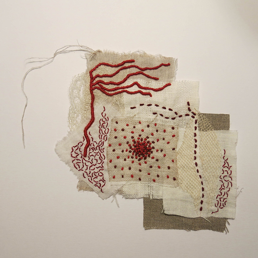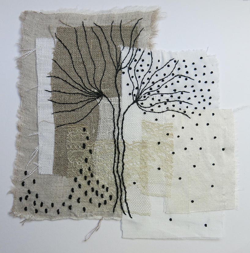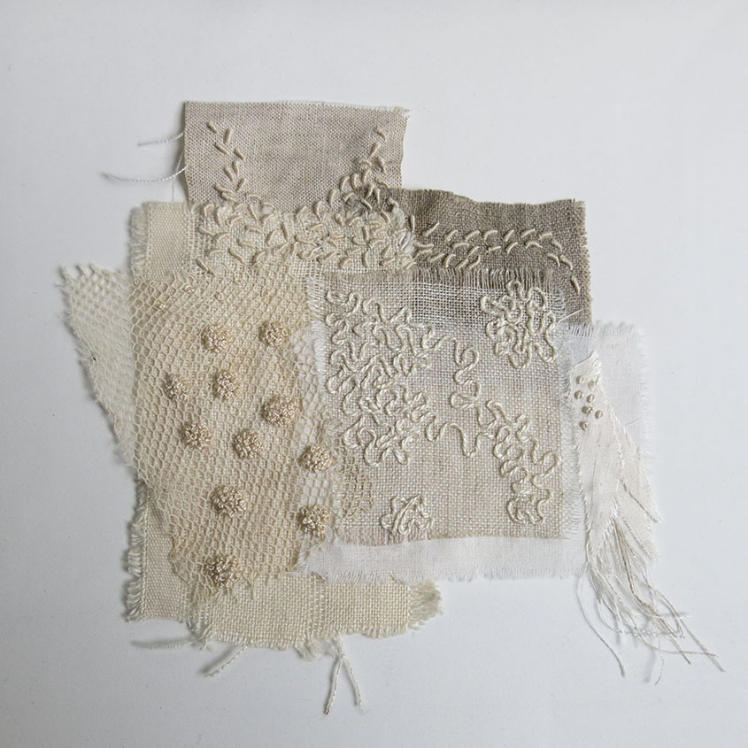 Assemblage par broderie, coton, soie, dentelle, coton perlé et mouliné
